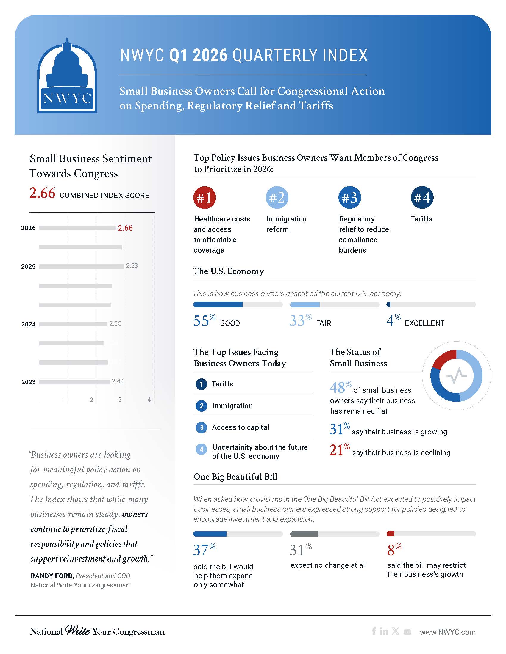 DALLAS—March 11, 2026—National Write Your Congressman (NWYC), an organization that gives small businesses a voice in government, released its Q1 2026 Index, highlighting small business sentiment toward Congress, the U.S. economy, and federal policies affecting business.